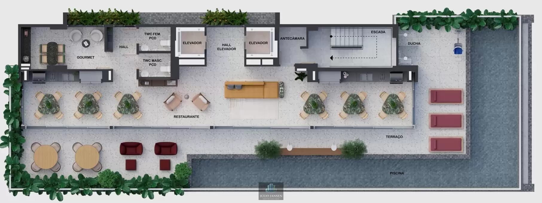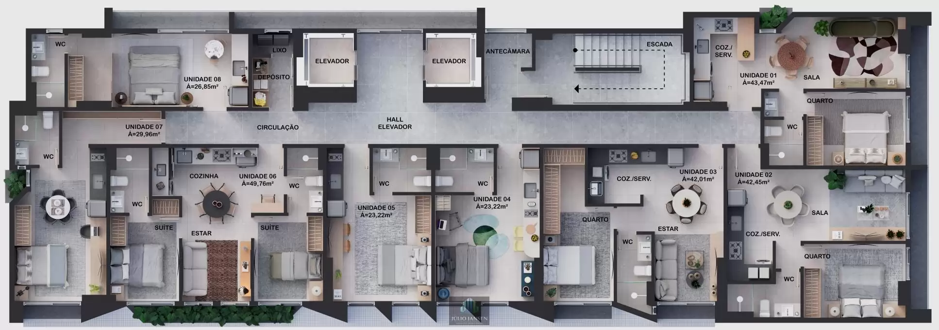 O empreendimento conta com studios e apartamentos com metragens que variam de 23 a 48 m², pensados para quem busca praticidade, conforto e excelente potencial de valorizaēćo.